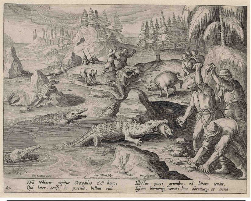 Крестьяне села Безродное отбиваются от крокодилов, напавших на скот. Иллюстрация из книги 1768 года.